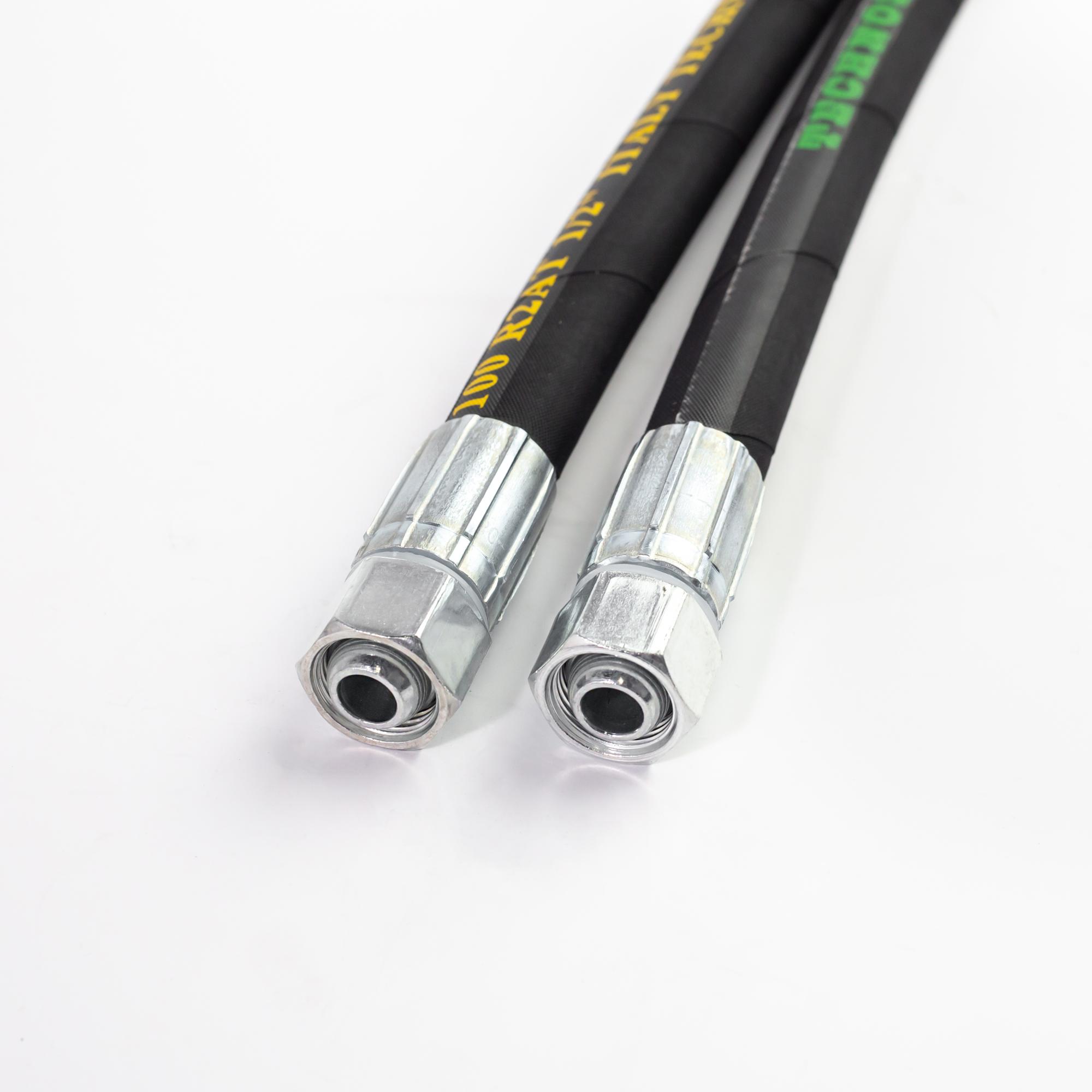 - Усиление: Две высокопрочные оплетки из стальной проволоки позволяют рукаву выдерживать рабочее номинальное давление до 275 бар. Двойной слой армирования минимизирует риск вздутия или разрыва при резких скачках давления.